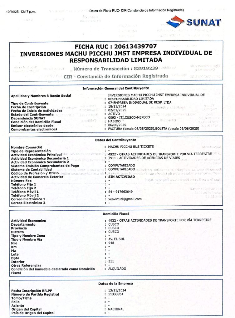 Somos una empresa local con oficina fisica en la ciudad del Cusco con un equipo local especializado en experiencias auténticas dentro del Valle Sagrado de los Incas. Nacimos con una misión clara: ofrecer a cada viajero una conexión real con la historia, la cultura y la naturaleza de Cusco y sus alrededores. No somos intermediarios impersonales; somos operadores locales que conocen cada ruta, cada comunidad y cada detalle que transforma un simple tour en una experiencia memorable. Nuestra pasión por el territorio se refleja en cada servicio que brindamos y en la forma cercana con la que acompañamos a nuestros viajeros.